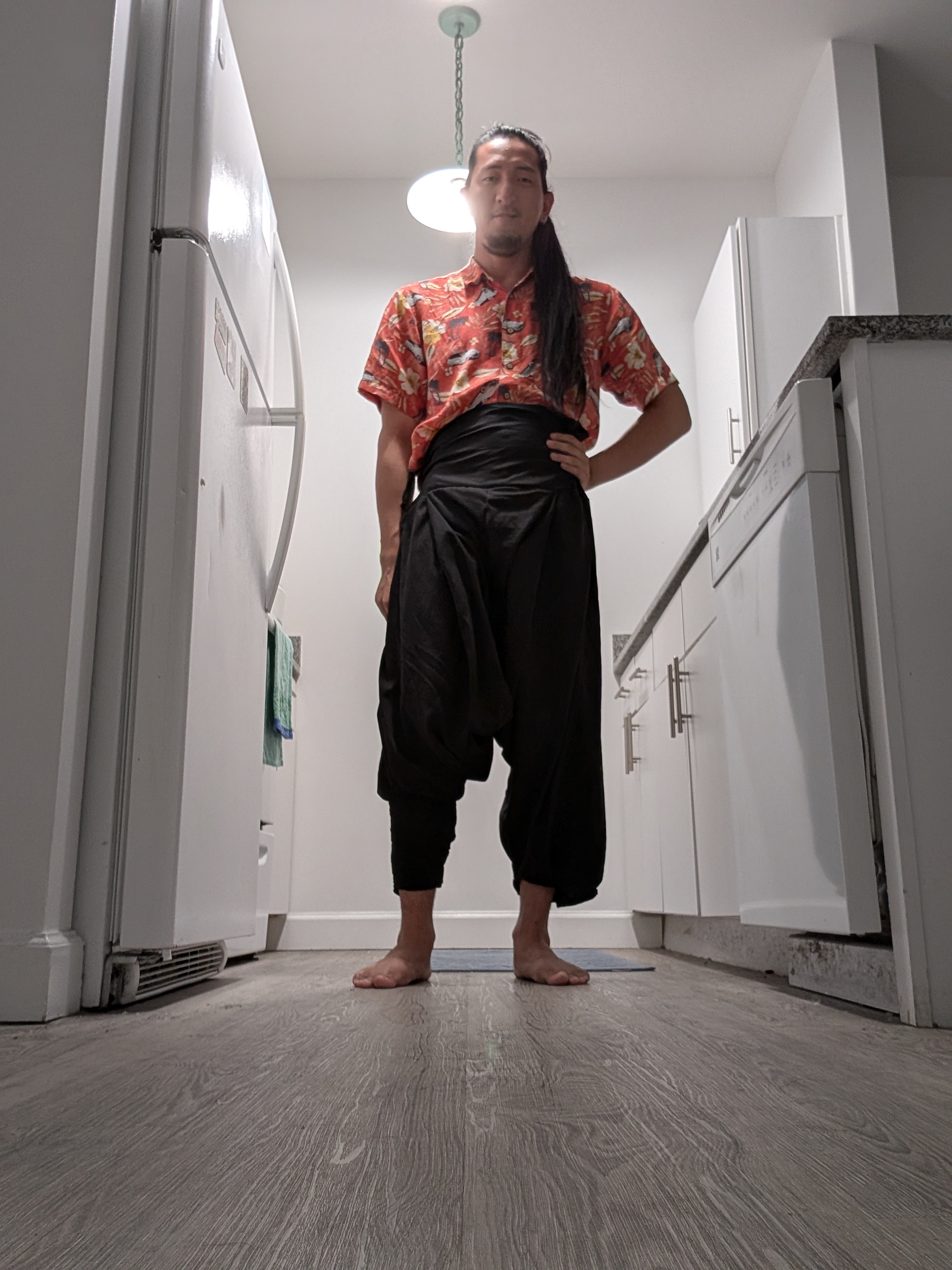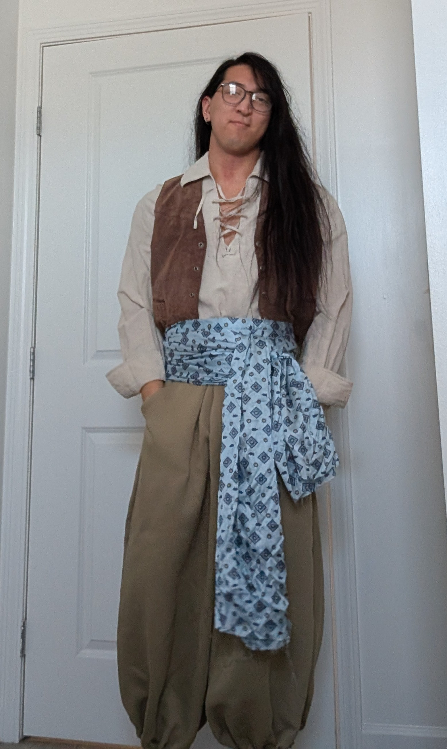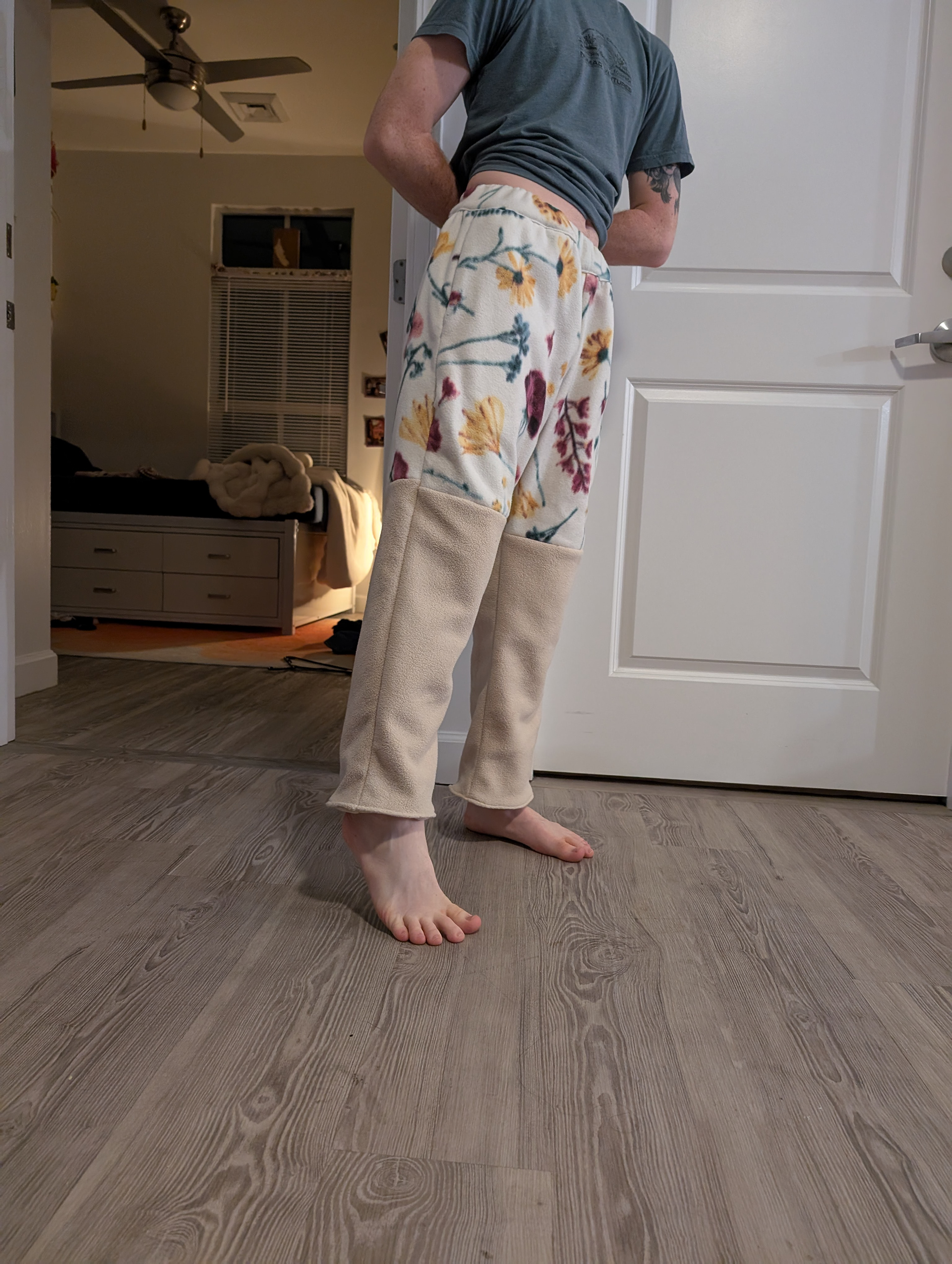 Attempted Rus pants (2) - cotton. Created with the desire for a lot of gathers and pleats. Around my right leg is a wrap, made of from the same fabric as the rest of the pants.