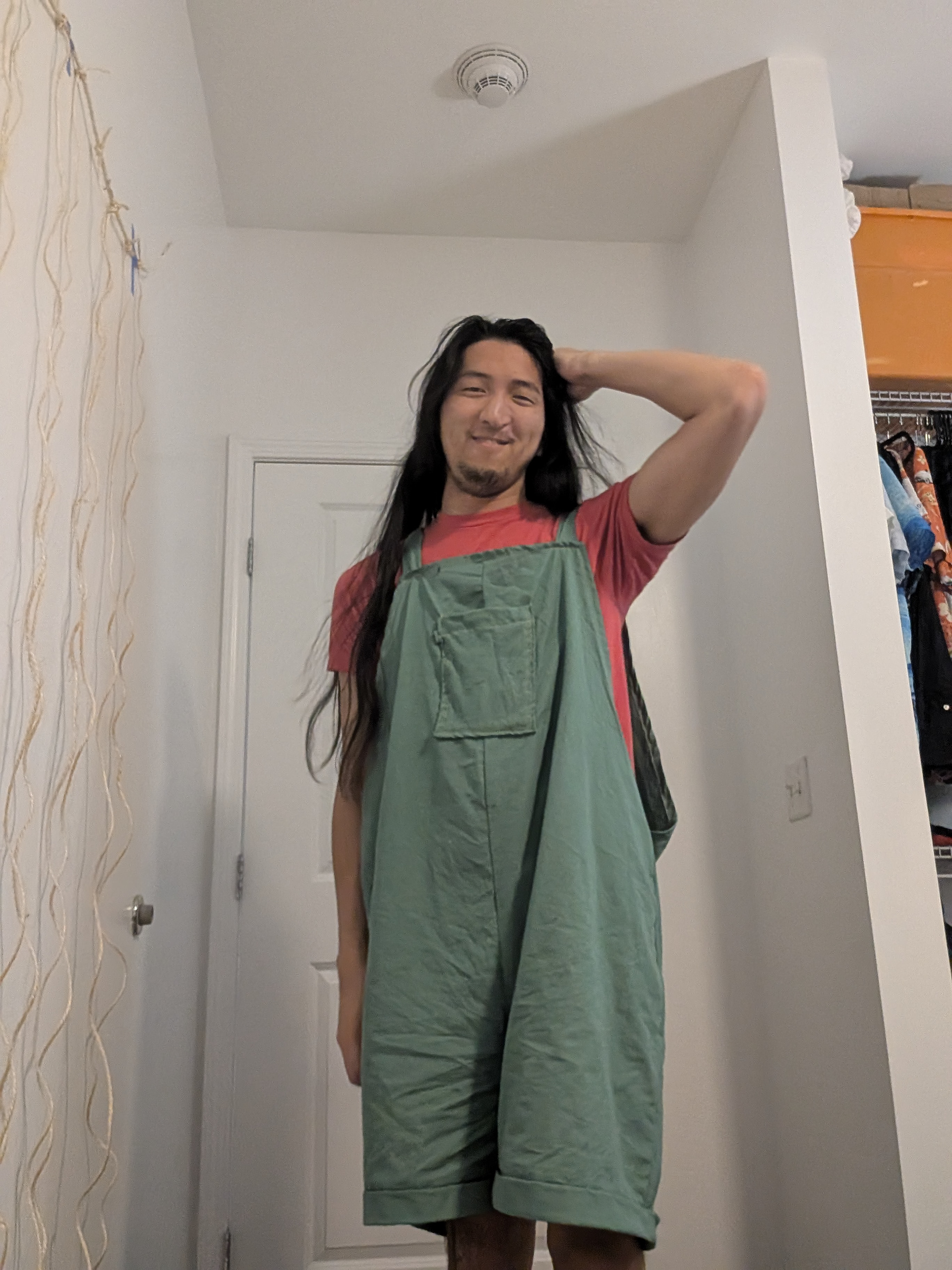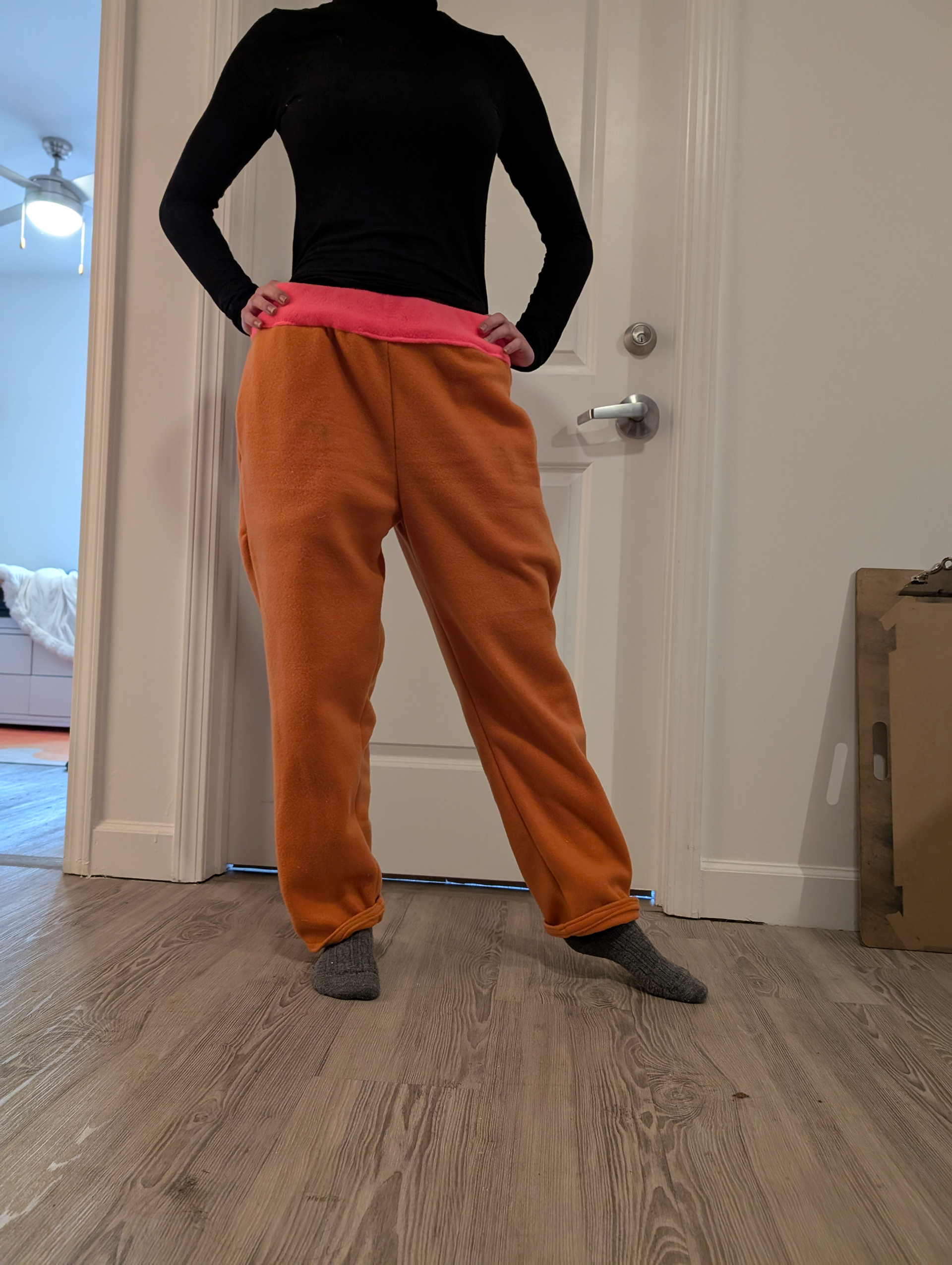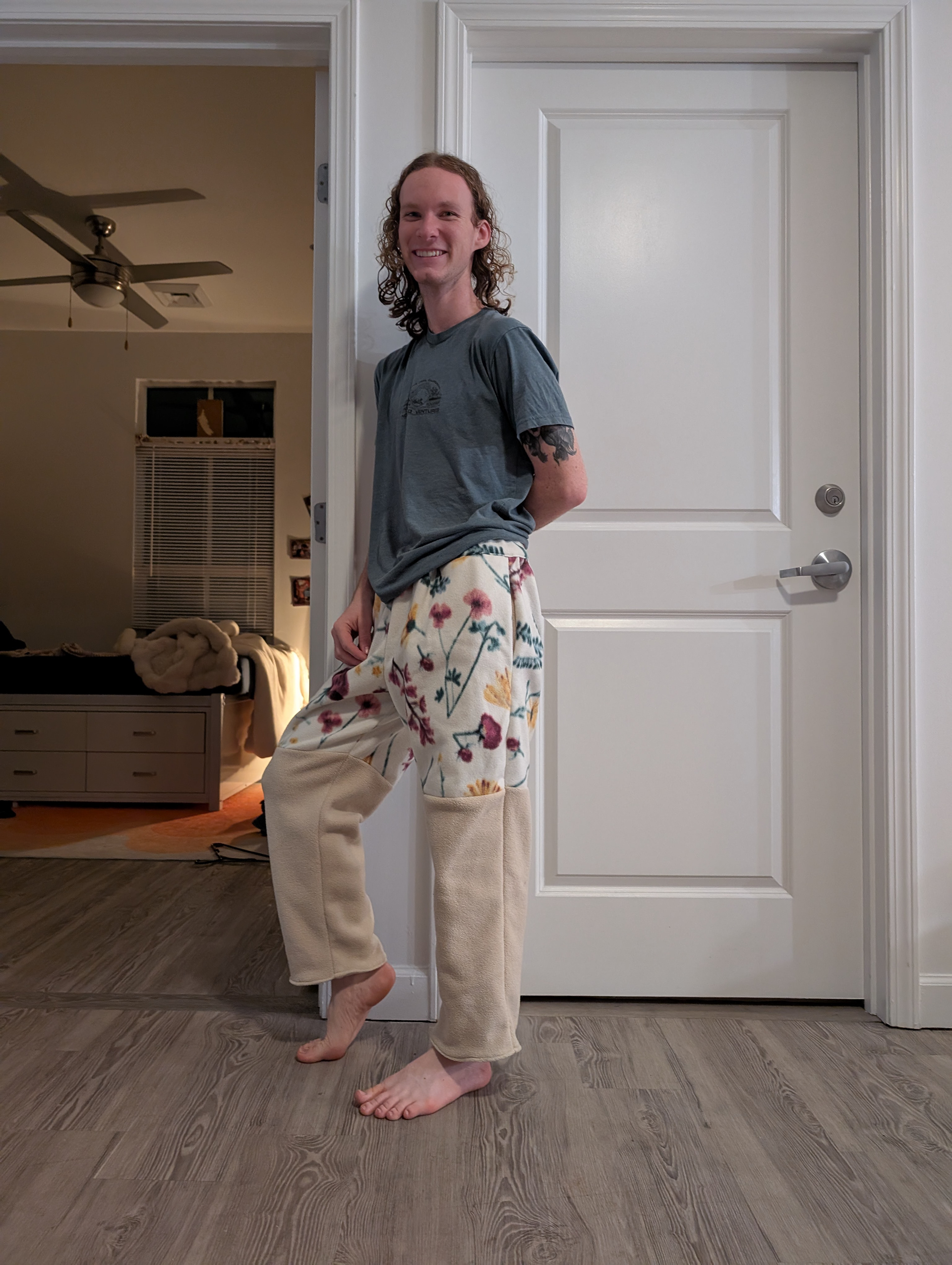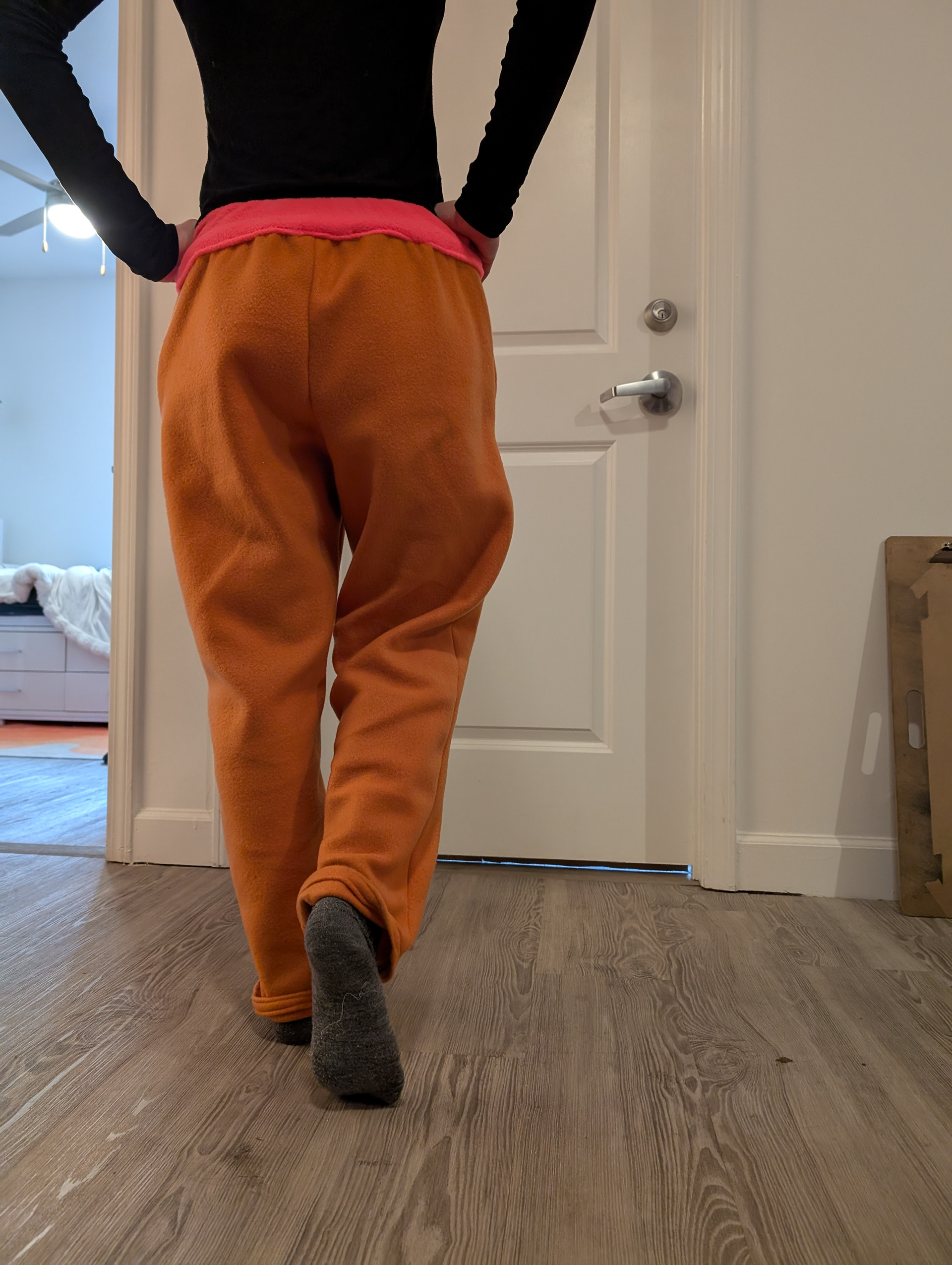 Attempted Rus pants (2) - cotton. Created with the desire for a lot of gathers and pleats. Around my right leg is a wrap, made of from the same fabric as the rest of the pants.