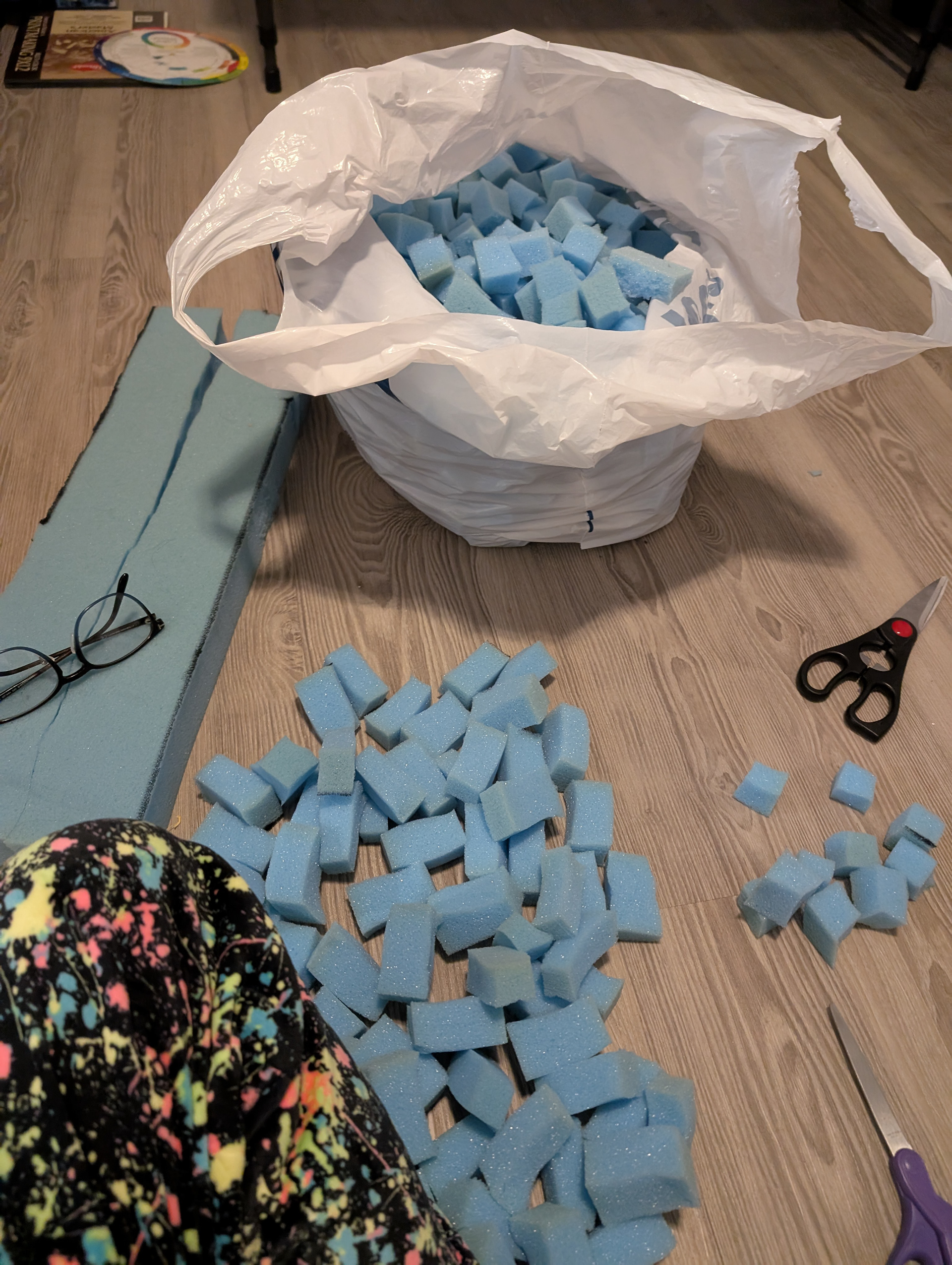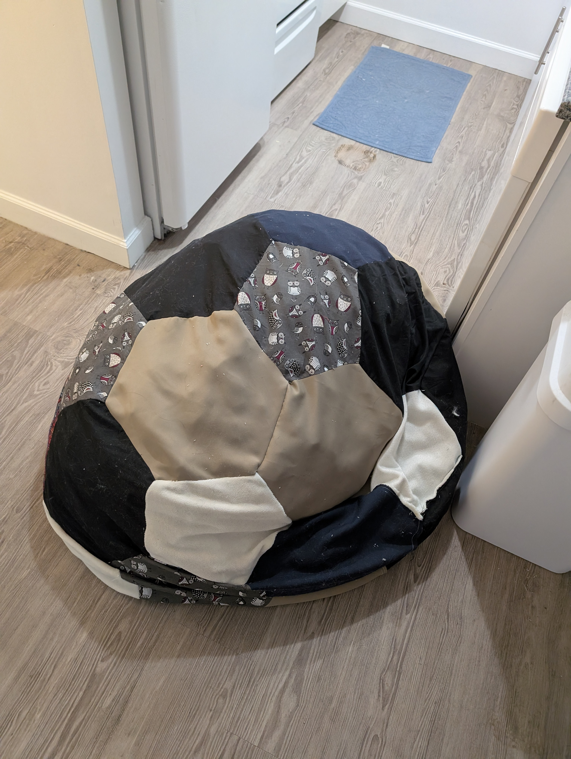 Created using leftover fabric pieces that were too small for most other projects. Stuffed with cut up foam and shredded scrap fabric.