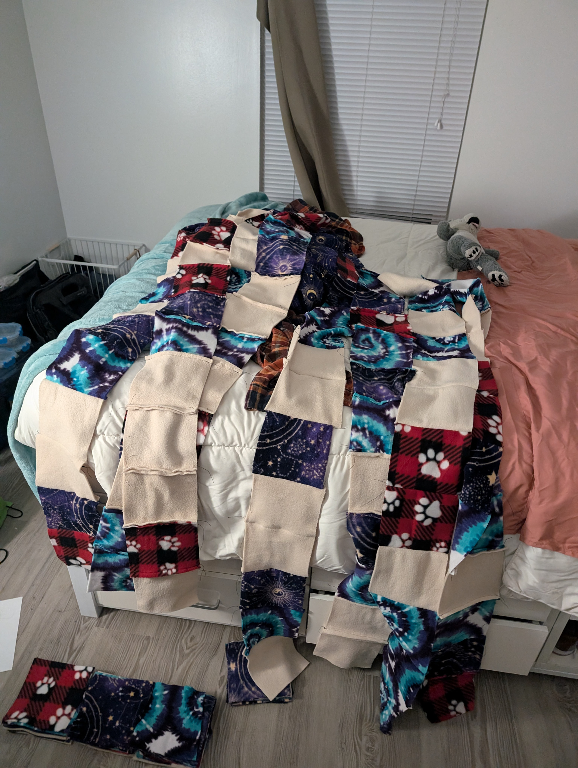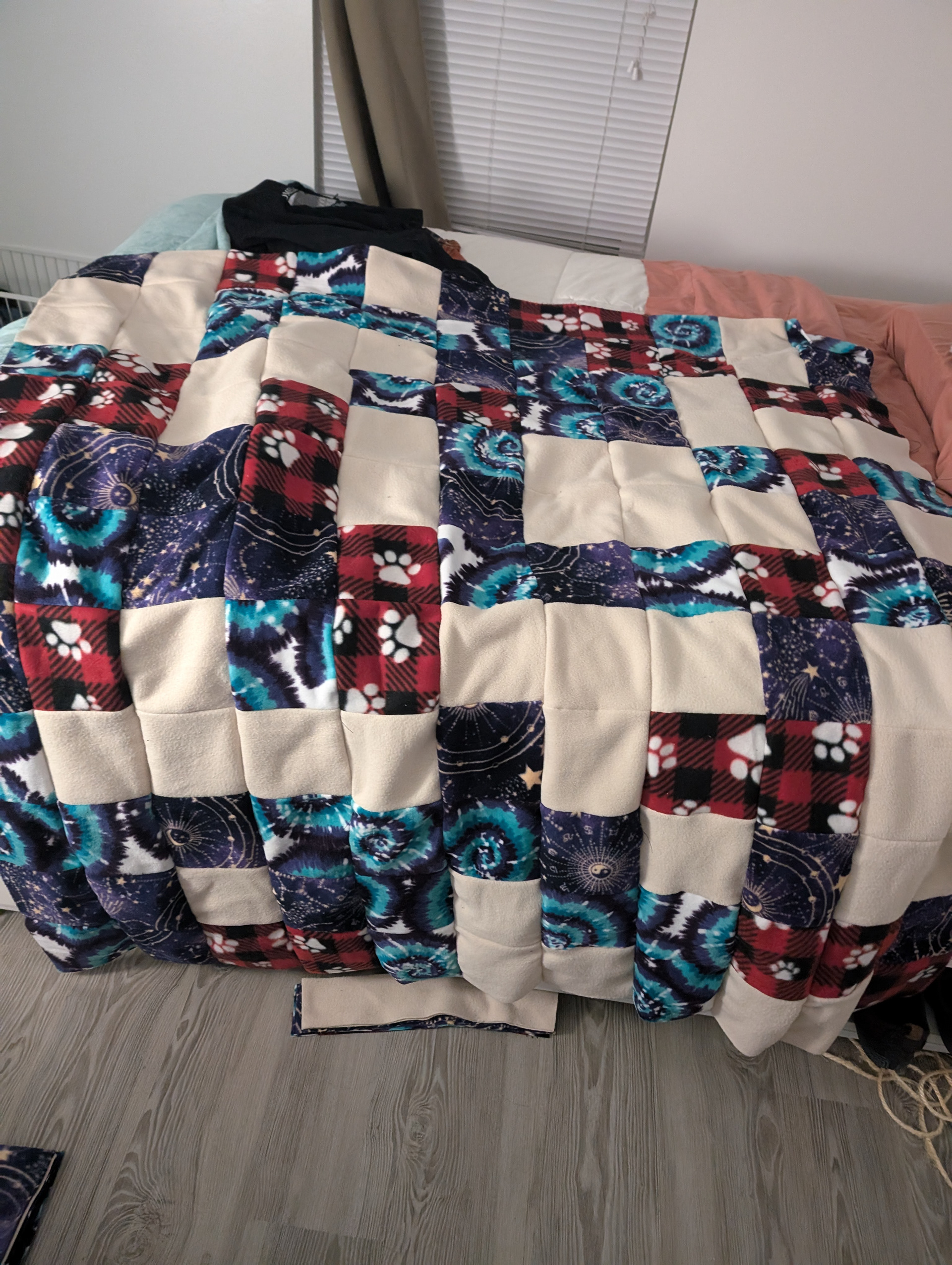 Quilt (4-5) - blizzard fleece. Stitched together 6"x6" squares from leftover projects and the remnants bin from Joan Fabrics.