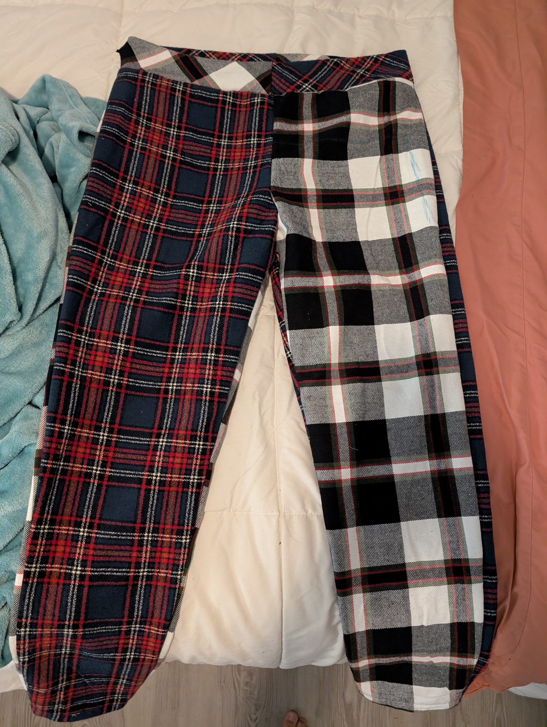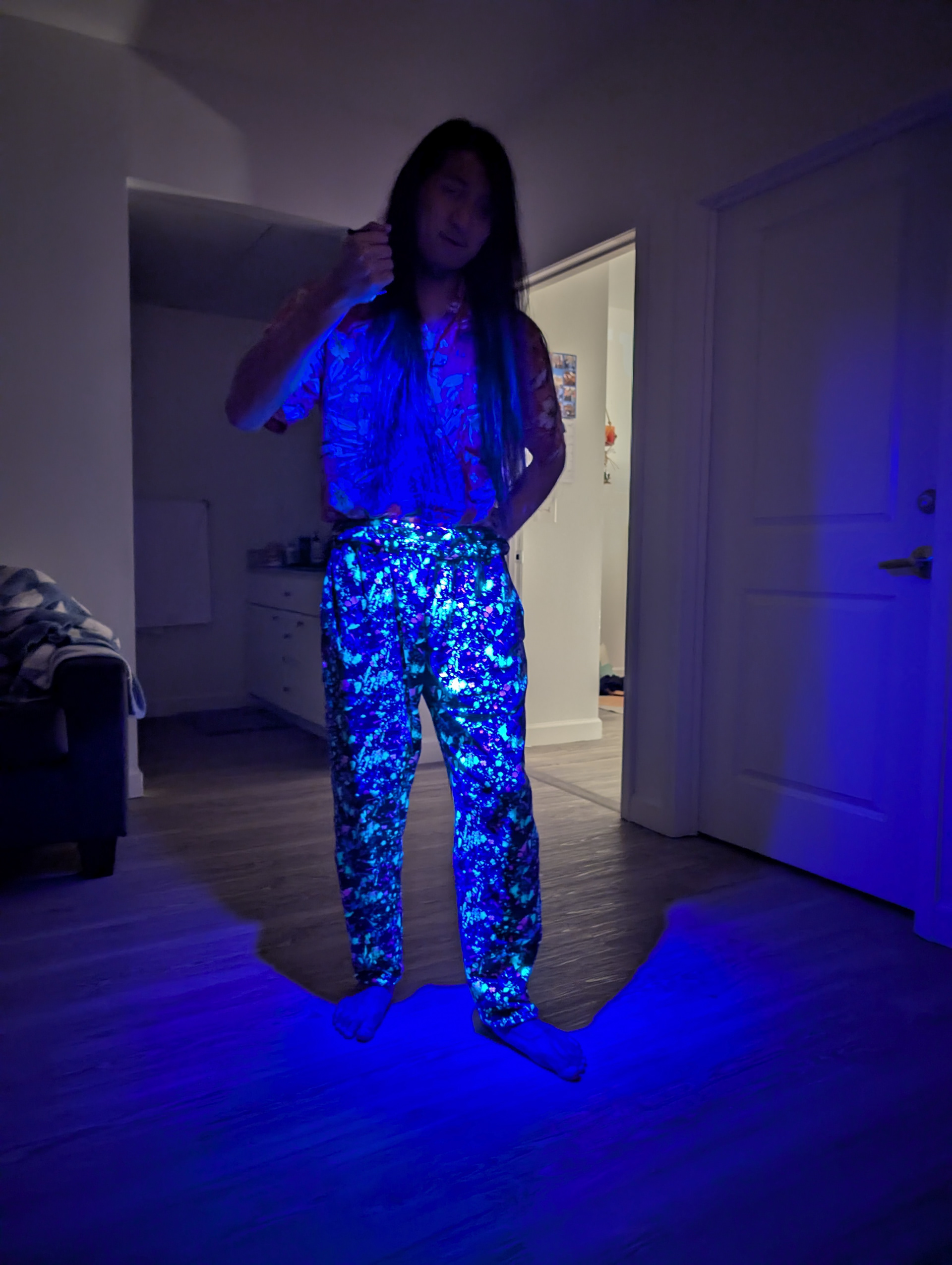 I experimented with variations of this pattern and how it reacts to different fabric types. Using fleece (top row), a stretchy UV reactive fleece (bottom left three), and printed flannel (bottom right).